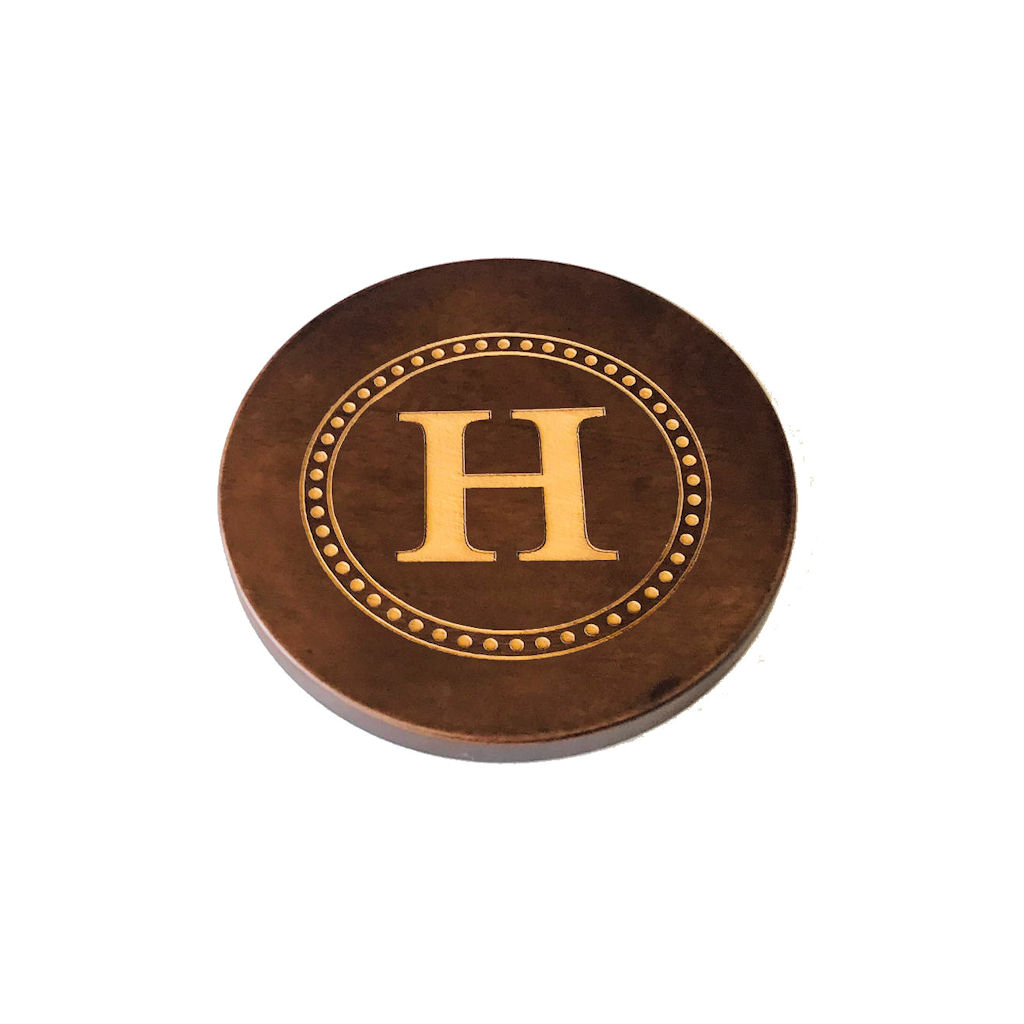 • These round easily personalized wood coasters are available in 4″x4″ in stained walnut finish.